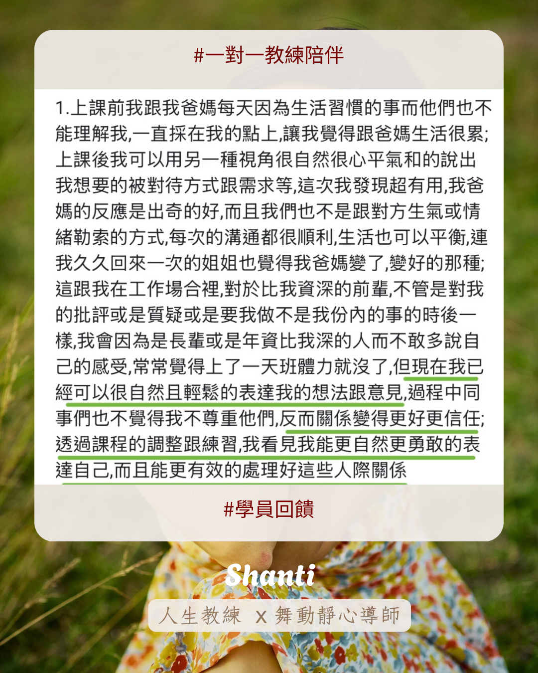 在Shanti的引導下打開了我對這世界的很多新觀點,這是我的原生家庭、學校裡學不到的,現在的我可以勇敢地去拒絕我不要的、拿取我要的。和同事、和家人建立起健康界線,相處起來也輕鬆了!慢慢地我允許自己在任何狀態裡,現在我終於可以鬆一口氣很好照顧我自己,也活得像自己了。