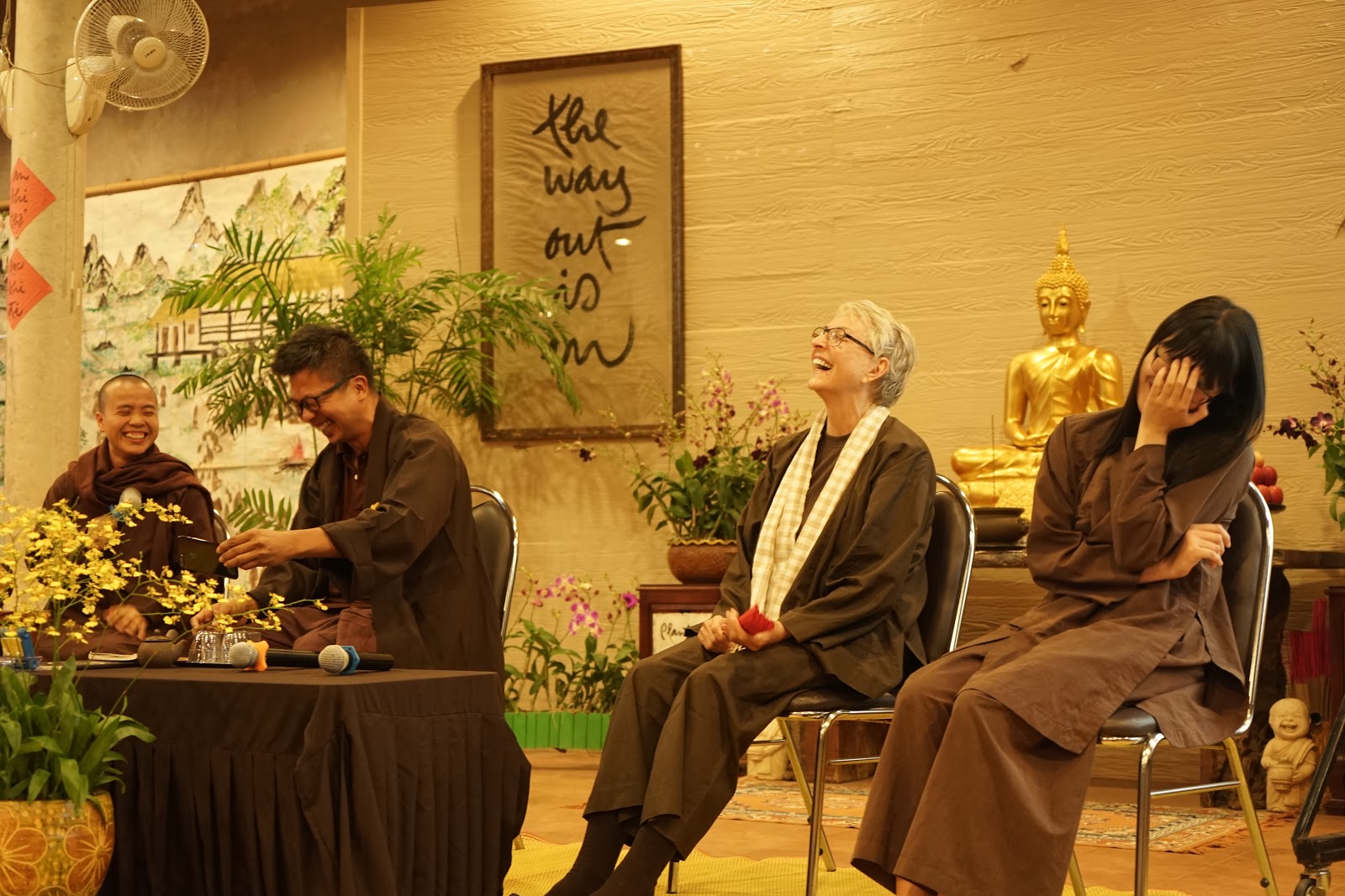 這堂「脫口秀」裡,法師邀請三位在家眾上台分享修習五項正念的成果、最有收穫的練習過程。這三位受邀者分別是: 20歲的香港女孩、77歲的美國阿嬤、40多歲的新加坡男子。香港女孩說,她從四歲就跟著母親開始接觸梅村,梅村的五項正念練習讓她度過了許多負面情緒的時刻,要不是時常提醒自己練習正念,她極有可能像其他壓力甚劇的香港同學一樣,選擇自殺一途 (她說在中學時,就曾有一學期將近20人跳樓自殺的案例,好驚人的數字!) 而77歲的美國阿嬤的心態很年輕,常常將笑容掛在臉上,分享她的婚姻哲學,雖然歷經多段婚姻與戀愛關係,她並不覺得每段關係的結束代表自己的失敗,事實上,每段關係裡都帶給她不同的成長功課,她這席話讓我有了不一樣的想法,長久以來東方文化總是勸和不勸離,不適合的關係仍苦撐著,痛苦又無法自拔,假如離婚了,社會的眼光往往當你是個失敗者、或者你有什麼問題等等,77歲美國阿嬤的分享,我覺得是鬆綁套在伴侶脖子上的繩子,給彼此自由,而且並非失敗、而是成長。後來我在走廊遇見她,對於她的分享表達感謝,讓我深受啟發,在擁抱禪時她一邊說:「重點不是有沒有婚姻關係,而是你過的快樂不快樂,如果有人給妳壓力,妳大可燦爛微笑答以:『I’m single, but I’m happy!』」阿嬤的快樂情緒好感染人。40歲的新加坡男子分享他過去的戀愛關係、以及他如何用較妥適的方式來導引、宣洩性能量,而不至於讓自己落入縱慾的處境。這堂脫口秀佛法課,充滿歡笑與幽默,挺喜歡這樣的氛圍。