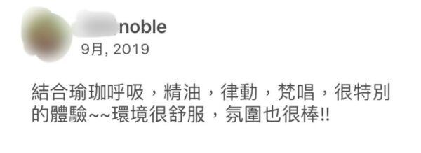 #「結合呼吸、瑜珈、精油、律動、梵唱,很特別的體驗~~~環境很舒服,氛圍也很棒!!」臺北,N小姐,37歲。