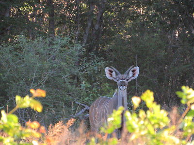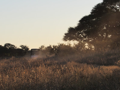 夕照下遇見了Kudu (鹿),機靈又謹慎的鹿群機警地看往車子方向,豎起耳朵觀望,像個盡責盯哨的士兵。也看到難得一見的Jackal (豺狼)在草原裡奔跑。最後,以我喜愛的大象家庭旅遊做為結尾,一段空白的寧靜,我們只是靜靜地觀賞,邊喝可樂配著夕照,象群在夕陽下緩行,揚起金黃色、閃閃發亮的沙塵。 😊