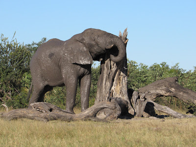 由住宿地點Ganda Lodge提供的徒步獵遊方式,早上9-12點(3小時),35美金。出發前,導遊在一旁裝填步槍子彈,我一邊問他是不是也要配給我一把?以防萬一嘛…,黑人導遊不意外的拒絕,因為我既沒用過步槍、一用還可能失誤導致打擊錯誤 😂。總之我以戰戰兢兢的心情、亦步亦趨的緊緊跟隨導遊前進,來到Hwange National Park(基萬國家公園)觀察野生動務。一路上豔陽高照,步行的緩慢速度只讓人感到更熱、汗流浹背。一邊走一邊擔心獅子要是從旁衝出來時自己該如何是好,似乎導遊的步槍沒有增加多少安全感,這樣的忐忑心情在導遊跟我說了一段話之後只有更為惶恐而已,他說前一年有導遊一樣徒步帶團時,因為反應不及而活活被獅子咬死,從脖子。天氣很熱,但不寒而慄。算了,安慰自己走一步算一步,機警一點吧。一路上沒遇見什麼動物,猜想徒步行仍有風險,導遊會特意帶走往較為安全的路線吧。只看到大型的蟻丘、非洲特有大而枯的大樹、還有龜裂的泥地,正當我們走過一處湖邊,導遊很靈敏的發現遠方樹叢裡可能有大象,於是我們先躲在樹後靜觀,果不其然,大象家族出來散步了! 導遊一邊說明:「我們要站在下風處,因為人類的味道很重,若站在上風處,風會把人類的味道帶到大象那裡,讓他們驚慌失措。」語落沒多久,似乎有一兩隻大象察覺不太對勁,不消兩三分鐘的時間變成集體大奔逃,第一次看到大象跑步如此靈活與快速…,哎,風終究將我們的味道帶到了那裡。