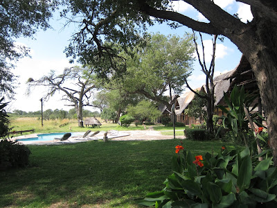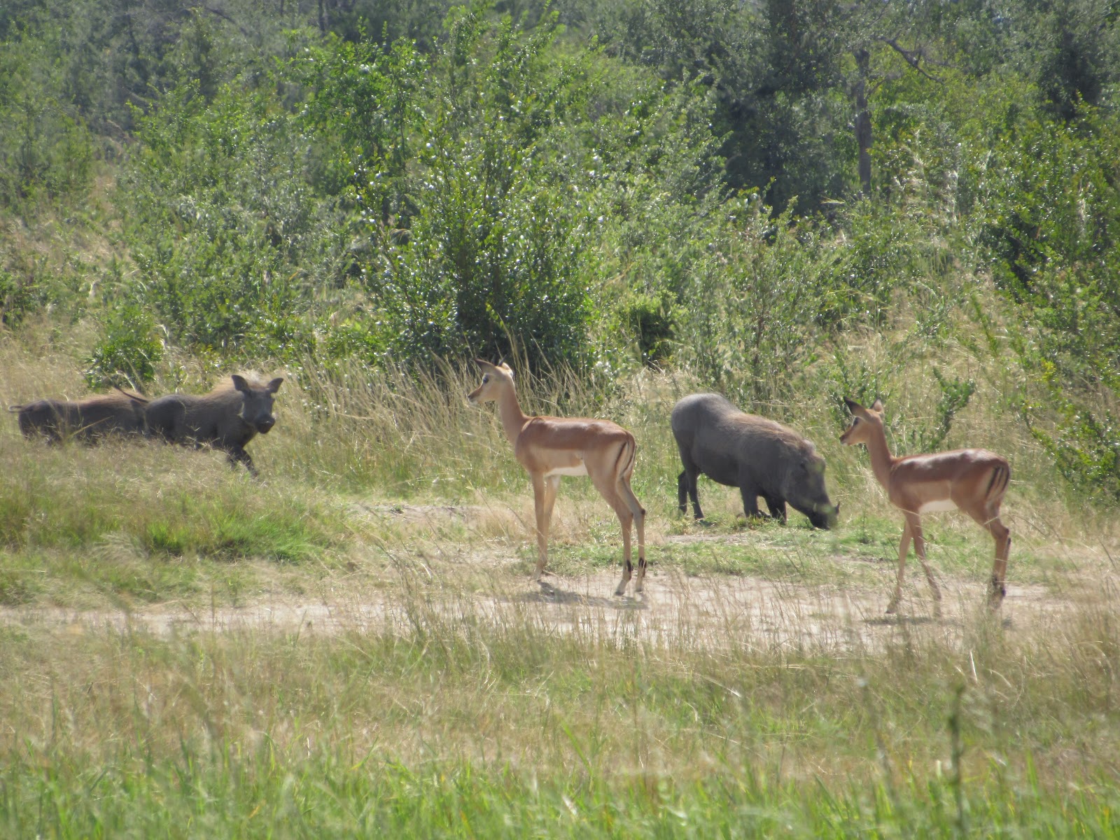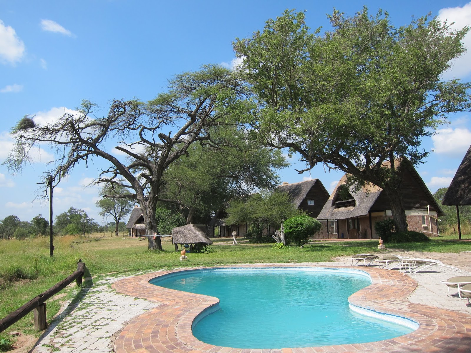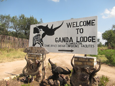 Ganda Lodge與原野的分野只有矮小的木圍籬,界線模糊得讓人彷彿即置身在原始大草原中,這裡靠近萬基國家公園(Hwange National Park),孕育著許多野生動植物,包括大象、水牛、獅子、羚、與許多水禽等不一而足。周圍還種了許多樹,清晨時刻鳥兒便開始在樹梢引喉高唱,悅耳宛轉;遠眺前方大池塘Ganda pan,斑馬最早出現、接續著小鹿斑比,身上停了許多鳥,共生互利;象群姍姍來遲,踏著緩慢穩重步伐、帶著整個大家族來湖邊喝水、戲水;成群的疣豬也慢慢跑來,我一瞥見那長長彎彎的獠牙,哎呀! 那不是《獅子王》裡的澎澎嗎? 只不過沒找到丁滿。