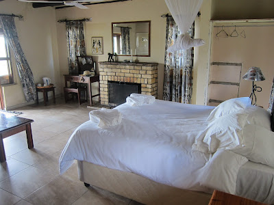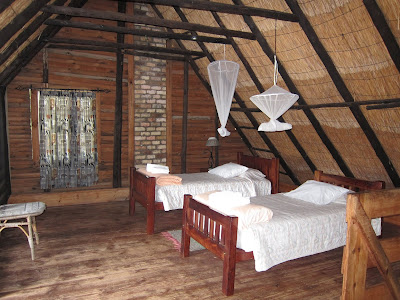 一路驅車抵達住宿地點Ganda Lodge,當天住宿客不多,到處走走逛逛,享受沒什麼人聲打擾的時光。我習慣先看看tripadviser的評價再決定住宿地點,此處果真是物超所值的選擇,2晚135美金,雖然沒有wifi,但享受整整三天與世隔絕的寧靜時光。獨棟大木屋可以住一個大家庭(4-6人),原始的非洲風格外觀,裡面的環境舒適乾淨而且空間寬廣,算一算非常划算,只不過我一個人,就獨享整棟的廣闊,兩天睡不同層樓,晚上看星星、起床看日出。