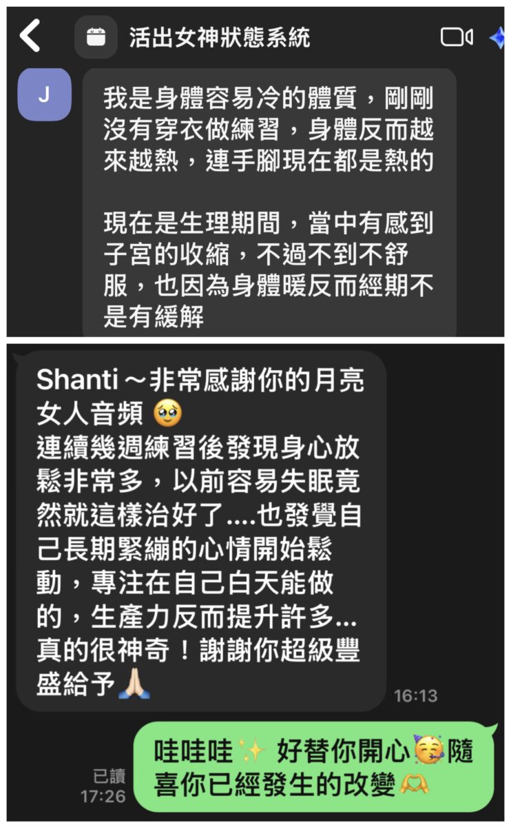 現在,Shanti專注於一對一的深度教練陪伴,透過舞動靜心、培養內在成熟陰性能量、性能量轉化與身心覺察,帶領女人提升內在狀態。她深信,當一個人由內而外地愛自己、接納自己,所身處的關係也自然變得和諧喜悅。