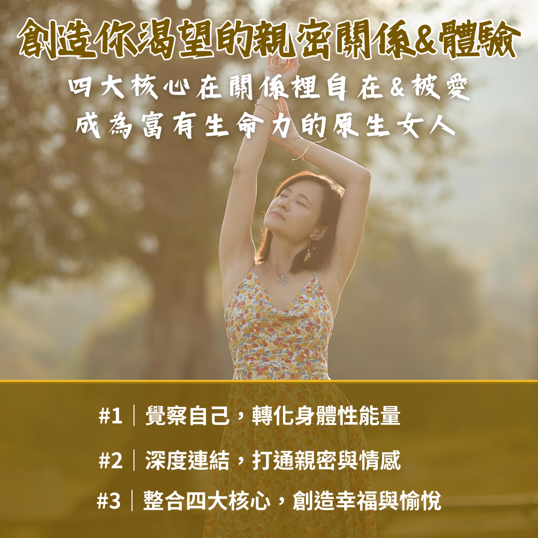 📌 綜合心理與身體練習,全面提升親密體驗 📌 建立日常能量與親密練習工具,持續自我成長 📌 四大核心八大模組,完整活出愛自己&創造和諧親密關係路徑指引,實現真正的身心自由