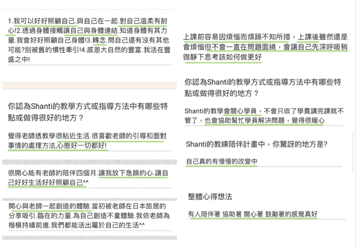 學員珊珊 & 小文各自在教練陪伴3個月的心得體驗,他們面臨的議題不同。珊珊發現她終於能實踐愛自己的精神、也改善與伴侶孩子的關係變得更融洽;而小文則改變她遇到挑戰就焦慮的習性,反而能情緒更穩定地迎接工作的任務,除了跟同事的互動變得更有溫度,也更勇敢跟上司表達自己的需求了。